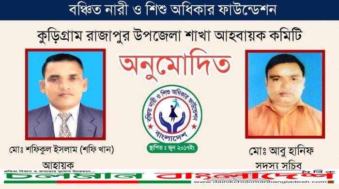সকল শিশুর অধিকার সুন্দর ভাবে বাঁচিবার এই প্রতিপাদ্য নিয়ে ২০১৭ সাল হতে চট্টগ্রাম তথা সারা দেশব্যাপী অসংখ্য সদস্যদের সমন্বয়ে আর্তমানবতার সেবায় অসহায় নারী ও শিশু অধিকার প্রতিষ্ঠায় নিরলসভাবে কাজ করে যাচ্ছে। উক্ত কাজের ধারাবাহিকতা বৃদ্ধির লক্ষে ২৪ সেপ্টেম্বর রোজ শনিবার বঞ্চিত নারী ও শিশু অধিকার ফাউন্ডেশনের কেন্দ্রীয় কার্যনির্বাহী কমিটির অবগত সাপেক্ষে আগামী ৩ মাসের জন্য মোঃ শফিকুল ইসলাম ( শফি খান) কে আহবায়ক ও মোঃ আবু হানিফ কে সদস্য সচিব করে কুড়িগ্রাম জেলা অন্তর্গত রাজাপুর উপজেলায় ১৩ সদস্য বিশিষ্ট আহবায়ক কমিটির অনুমোদন প্রদান করেন ফাউন্ডেশনের কেন্দ্রীয় মহাসচিব মুহাম্মদ আলী।
