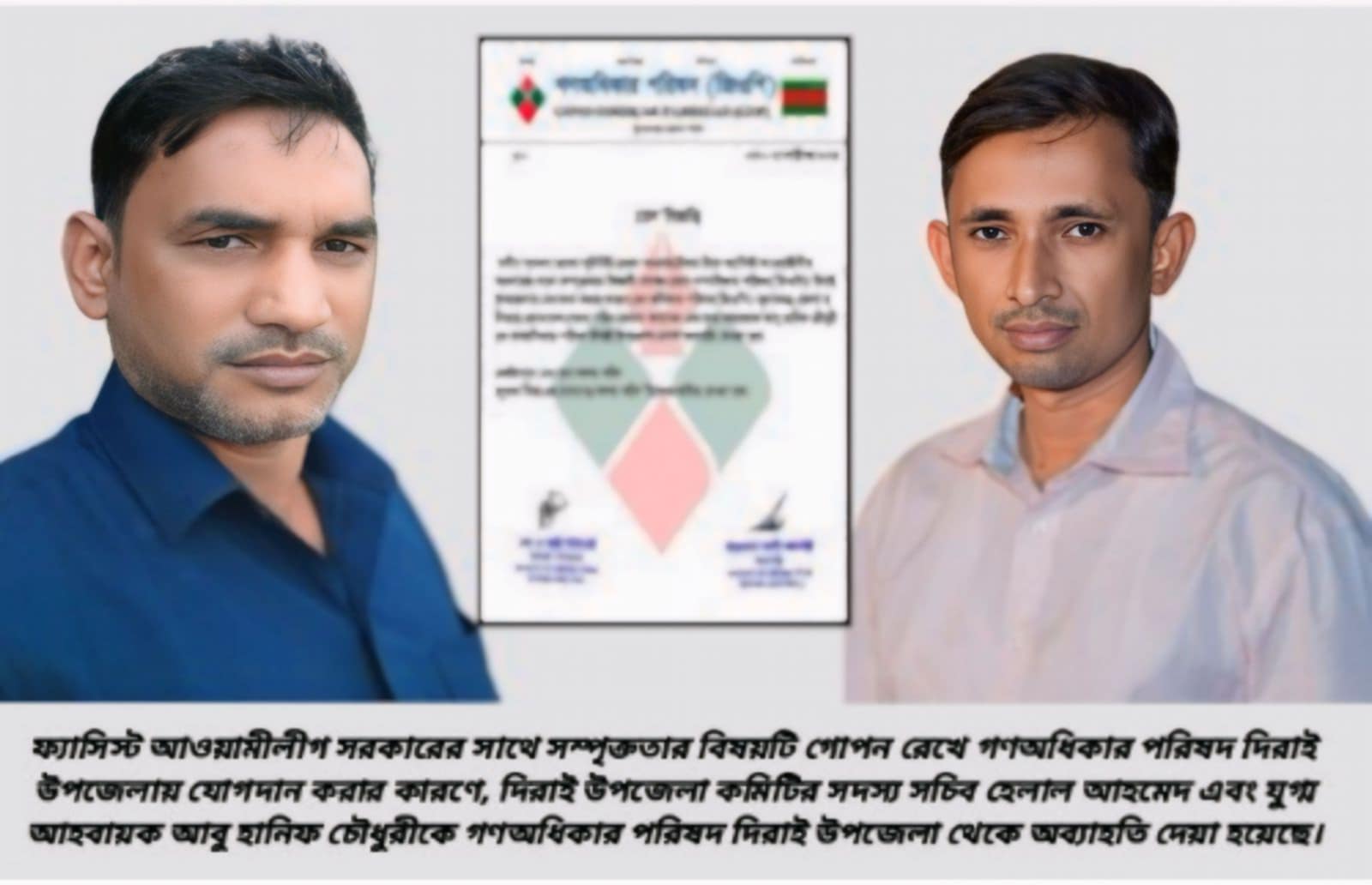 গণ অধিকার পরিষদ সূত্রে জানা যায়, অব্যাহতিপ্রাপ্ত আবু হানিফ চৌধুরী বিগত দিনে আওয়ামী লীগের রাজনীতির সঙ্গে সরাসরি সম্পৃক্ত থাকার বিষয়ে প্রমাণ মিলেছে। তিনি দিরাই শাল্লার সাবেক এমপি জয়া সেনগুপ্তা, প্রয়াত এমপি সুরঞ্জিত সেনগুপ্ত, ছাতক-দোয়ারার সাবেক এমপি মুহিবুর রহমান মানিকসহ দিরাই উপজেলা আওয়ামী লীগের সাধারণ সম্পাদক প্রদীপ রায়ের আস্থাভাজন সহচর ছিলেন। এছাড়া কেন্দ্রীয় আওয়ামী লীগের সাংগঠনিক সম্পাদক আহমদ হোসেনের সঙ্গেও তার দহরমমহরম সম্পর্কের প্রমাণ পাওয়া যায়। এছাড়া অপর অব্যাহতিপ্রাপ্ত হেলাল আহমেদ সুনামগঞ্জ জেলা আওয়ামী লীগের উপ প্রচার সম্পাদক ও দিরাই উপজেলার জগদল ইউনিয়ন পরিষদের চেয়ারম্যান হুমায়ুন রশীদ লাভলুর ঘনিষ্ঠ কর্মী।