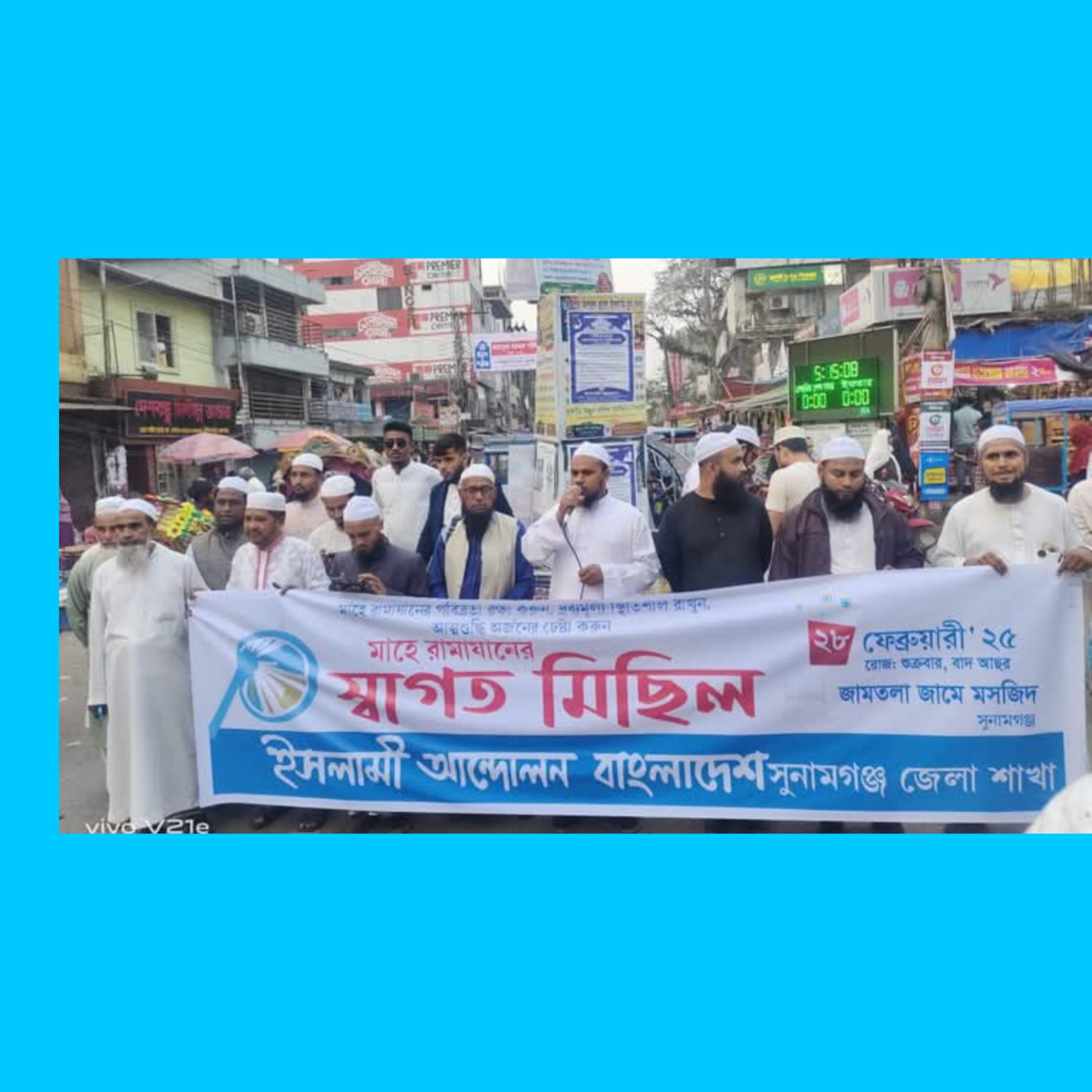 শুক্রবার বিকালে (বাদ আছর) সুনামগঞ্জ জামতলা মসজিদ থেকে শুরু হয়ে মিছিলটি প্রধান প্রধান সড়ক প্রদক্ষিণ শেষে ট্রাফিক পয়েন্টে এসে সমাবেশে মিলিত হয়।