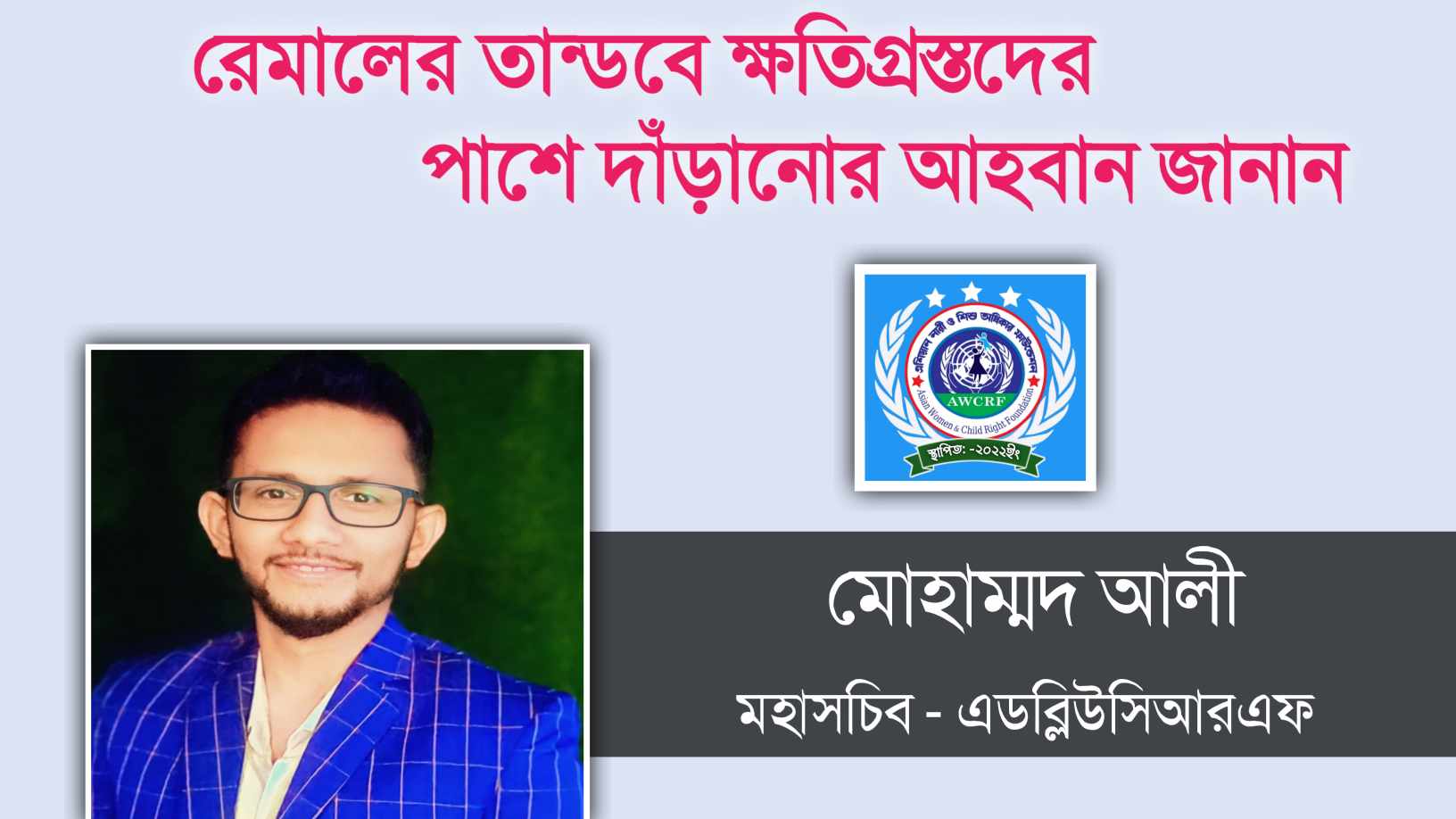 ঘূর্ণিঝড় রেমালের তান্ডবে ক্ষতিগ্রস্তদের পাশে দাঁড়ানোর আহবান – এডব্লিউসিআরএফ এর মহাসচিব মোহাম্মদ আলী