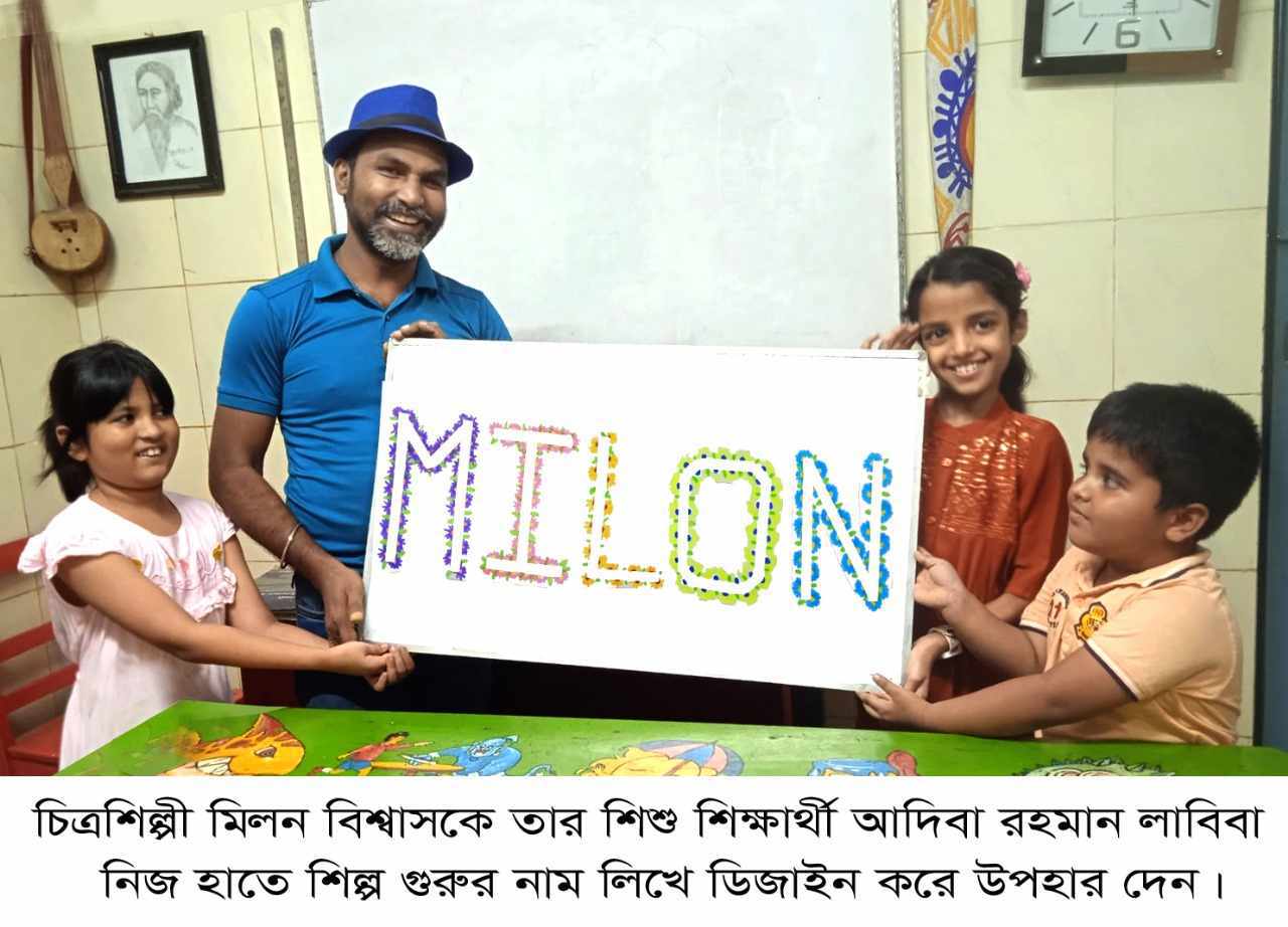 চিত্রশিল্পী মিলন বিশ্বাস শিক্ষার্থী আদিবা রহমান এর কাছ থেকে কেলিওগ্রাফি আর্ট উপহার পেয়ে আনন্দিত