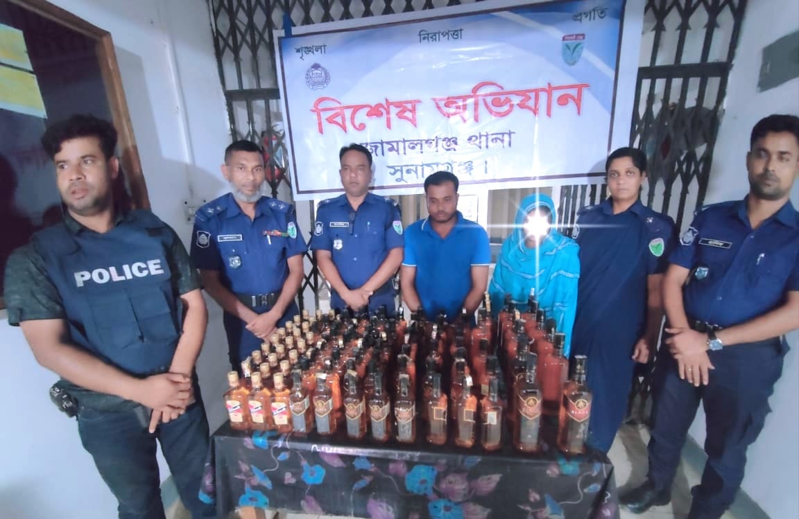 সুনামগঞ্জ জেলার জামালগঞ্জ থানা এলাকায় মাদক উদ্ধার ও বিশেষ অভিযান পরিচালনাকালে গোপন সংবাদের ভিত্তিতে অফিসার ইনচার্জের নির্দেশক্রমে এসআই জুলহাস উদ্দিন ও এসআই গোলাম সরওয়ার সরকার অদ্য ০৮-০৫-২০২৩ খ্রি. দুপুর ০১:১৫ ঘটিকায় জামালগঞ্জ থানাধীন চানপুর শেখহাটি সাকিনের গ্রেফতারকৃত ১নং আসামি বদিউজ্জামানের বসতঘরে সঙ্গীয় অফিসার ও নারী কনস্টাবল সুপ্রিয়া বালা দাসের সহায়তায় অভিযান পরিচালনা করে মাদক ব্যবসায়ী মনমিলা আক্তার (২৩), স্বামী-মোঃ বদিউজ্জামান, সাং-চাঁনপুর (শেখহাটি), থানা-জামালগঞ্জ, জেলা-সুনামগঞ্জকে আটক করেন। আটককৃত আসামির বসতঘরে তল্লাশি করে আসামির হেফাজতে থাকা McDowell's মদ ২৫ বোতল ও AC Black মদ ৮০ বোতল সর্বমোট ১০৫ (একশত পাঁচ) বোতল ভারতীয় আমদানি নিষিদ্ধ মদ উদ্ধারপূর্বক সাক্ষীদের উপস্থিতিতে জব্দ তালিকামূলে জব্দ করা হয়। পরবর্তীতে গ্রেফতারকৃত আসামির নিকট হতে প্রাপ্ত তথ্যের ভিত্তিতে জব্দকৃত ভারতীয় মাদ ক্রয় ও বিক্রয়ের সাথে জড়িত পলাতক আসামি বদিউজ্জামান (৩০), পিতা-মৃত বিল্লাল উদ্দিন, সাং-চাঁনপুর (শেখহাটি), থানা-জামালগঞ্জ, জেলা-সুনামগঞ্জকে জামালগঞ্জ থানা এলাকা হতে অভিযান পরিচালনা করে গ্রেফতার করা হয়। ধৃত আসামিদ্বয় পরস্পর যোগসাজসে উদ্ধারকৃত বিদেশি মদ বিক্রয়ের উদ্দেশ্যে নিজেদের হেফাজতে রাখে। তারা পেশাদার মাদক ব্যবসায়ী। আসামিদ্বয় দীর্ঘদিন যাবৎ বিদেশি আমদানি নিষিদ্ধ মদসহ অন্যান্য নেশা জাতীয় মাদকদ্রব্য ক্রয়-বিক্রয় করে আসছিল বলে তথ্য পাওয়া যায়। উক্ত বিষয় গ্রেফতারকৃত আসামিদ্বয়ের বিরুদ্ধে জামালগঞ্জ থানায় মাদকদ্রব্য নিয়ন্ত্রণ আইনে একটি নিয়মিত মামলা রুজু করা হয়েছে। আসামিদ্বয়কে পুলিশ স্কটের মাধ্যমে বিজ্ঞ আদালতে প্রেরণের প্রস্তুতি গ্রহণ করা হয়েছে।