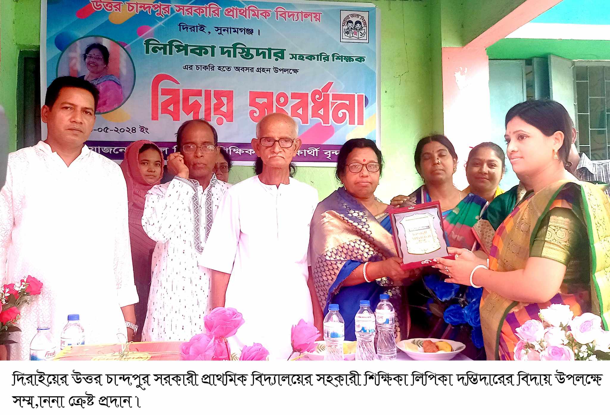 দিরাইয়ে শ্রেষ্ট শিক্ষিকা লিপিকা দস্তিদারের অবসরে যাওয়ায় বিদায় সংবর্ধনা ও সম্মাননা ক্রেষ্ট প্রদান