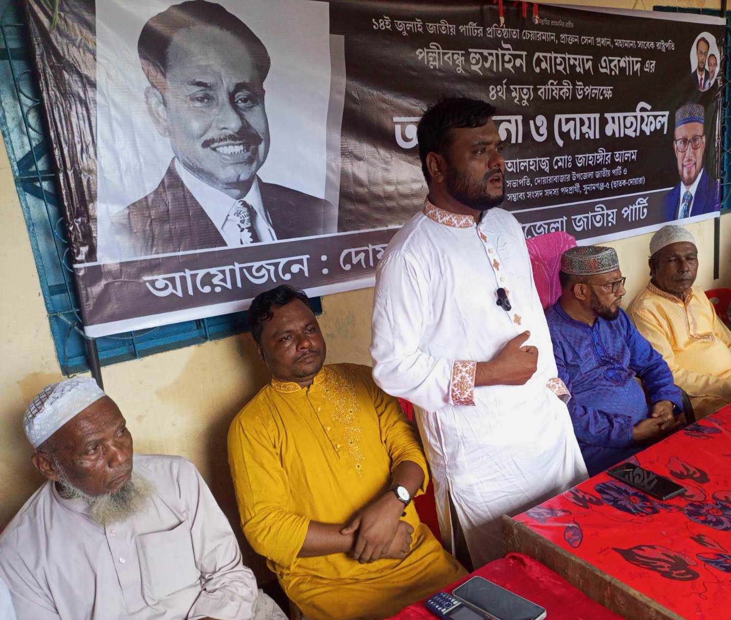 শুক্রবার বাদ জুমআ দোয়ারাবাজার উপজেলা জাপা'র উদ্যোগে সাবেক রাষ্ট্রপ্রধান ও জাতীয় পার্টির প্রতিষ্ঠাতা চেয়ারম্যান আলহাজ্ব হুসেইন মুহম্মদ এরশাদের ৪র্থ মৃত্যুবার্ষিকী পালন উপলক্ষে আয়োজিত সংবাদ আলোচনা ও দোয়া মাহফিলে উপজেলা জাপা'র সাংগঠনিক সম্পাদক নুর হোসেন মো. আব্দুল্লাহ'র পরিচালনায় আলহাজ্ব মো. জাহাঙ্গীর আলম উপরোক্ত কথা বলেন। এসময় অন্যান্যদের মধ্যে বক্তব্য রাখেন উপজেলা জাপা'র সহসভাপতি আরজ আলী,সাধারণ সম্পাদক হাবিবুল্লাহ হেলালী, যুগ্ম সাধারণ সম্পাদক ইকবাল হোসেন বুলু, উপজেলা যুবসংহতির সভাপতি মুজিবুর রহমান, উপজেলা স্বেচ্ছাসেবক পার্টির সভাপতি মো. এখলাছ মিয়া, সাধারণ সম্পাদক আবুল কালাম, জাপা নেতা মাশুক মিয়া, জায়ফর আলী, সামছু মিয়া, সিরাজ উদ্দিন, গোলাম মোস্তফা, সেলিম উদ্দিন, সোলেমান সিদ্দিক, সোহেল আহমদ, আলী হোসেন প্রমুখ। গণভোজন শেষে জাপা নেতা আলহাজ্ব মো. জাহাঙ্গীর আলম উপজেলা সদরের বিভিন্ন এলাকায় গণসংযোগ করেন।