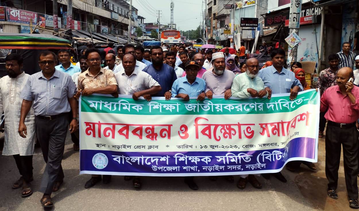 মাধ্যমিক শিক্ষা জাতীয় করণের দাবিতে নড়াইলে মানববন্ধন বিক্ষোভ মিছিল ও সমাবেশ অনুষ্ঠিত হয়েছে। ১৩জুন মঙ্গলবার সকাল ১১টায় বাংলাদেশ শিক্ষক সমিতি নড়াইল জেলা শাখার আয়োজনে একটি বিক্ষোভ মিছিল নড়াইল ভিক্টোরিয়া কলেজিয়েট মাধ্যমিক বিদ্যালয় চত্বর থেকে শুরু হয়ে নড়াইল প্রেসক্লাবের সামনে নড়াইল যশোর সড়কে মানববন্ধন শেষে শহরের প্রধান প্রধান সড়ক প্রদক্ষিন করে জেলা শিল্পকলা একাডেমি চত্বরে গিয়ে শেষ হয়।