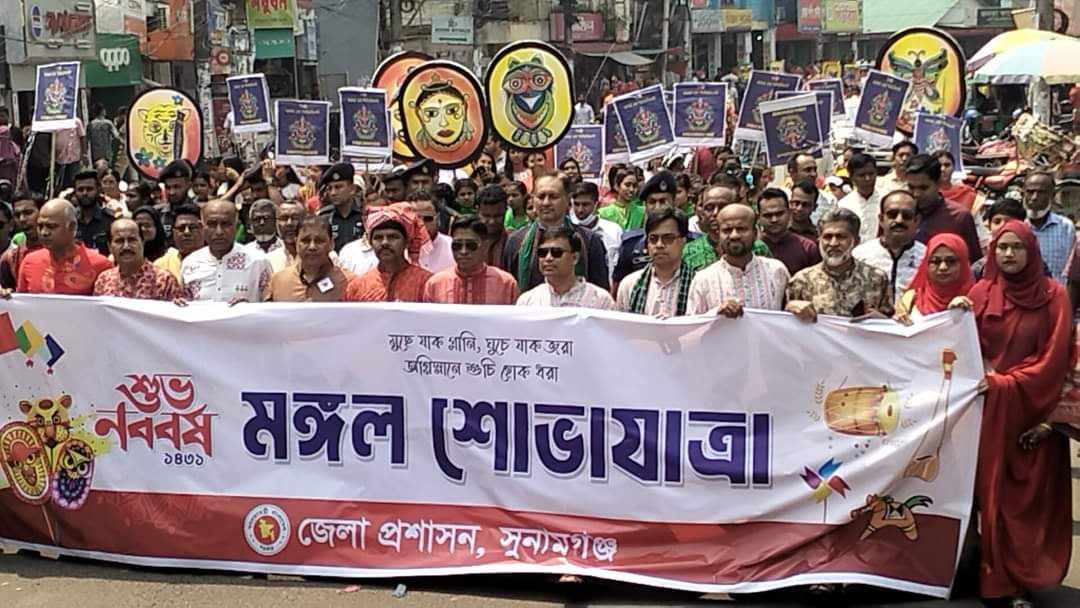 বেলা ১১ টায় জাতীয় সঙ্গীত আমার সোনার বাংলা ও রবী ঠাকুরের বর্ষবরণের জনপ্রিয় গান ‘এসো হে বৈশাখ এসো এসো’ গাওয়ার পর পরই সুনামগঞ্জের জেলা প্রশাসকের কার্যালয়ের সামনে থেকে বর্ষবরণের বর্ণাঢ্য শোভাযাত্রা বের হয়।