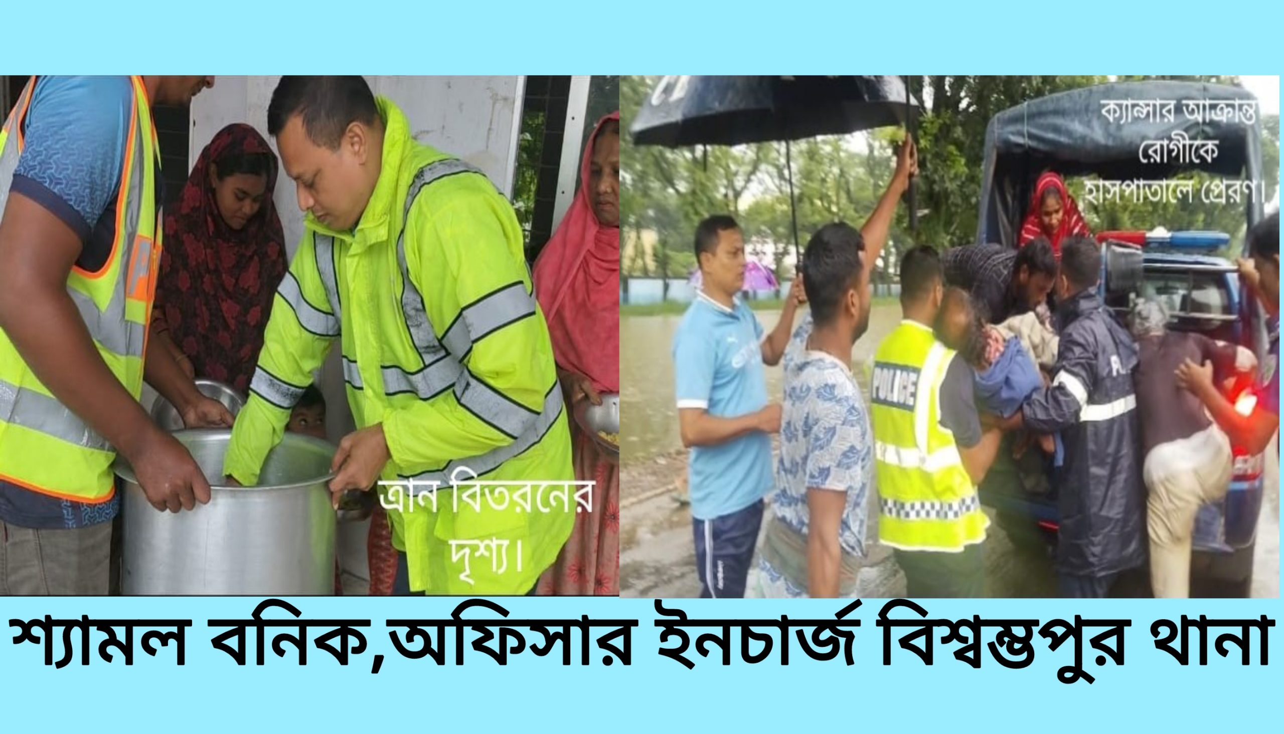 বিশ্বম্ভরপুর থানা পুলিশের উদ্যোগে বন্যার্তদের উদ্ধার ও খাদ্য সামগ্রী বিতরন