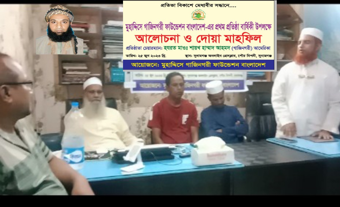 ফাউন্ডেশনের উপদেষ্টা হাফিজ আতাউর রহমান লস্কর'র সভাপতিত্বে ও এম.মাহফুজুর রহমান সজিব'র সঞ্চালনায় উক্ত আলোচনা ও দোয়া মাহফিলে প্রধান অতিথি হিসেবে উপস্থিত ছিলেন মুহাদ্দিসে গাজীনগরী ফাউন্ডেশন বাংলাদেশ, সুনামগঞ্জ পৌরসভা কমিটির উপদেষ্ঠা হযরত মাও.মুবাশ্বির আলী বর্মাউত্তরী এবং প্রিন্সিপাল মাও.আব্দুস শহীদ (ইসলামী আন্দোলন নেতা)ও মুফতি এহসান রেজা মুহিবী৷