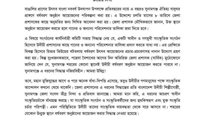 সুনামগঞ্জে ডিসির নিষেধ অমান্য করে বর্ষবরণ পালন করলো উদীচী শিল্পীগোষ্ঠী সুনামগঞ্জে বাণী সংগীত প্রশিক্ষণ কেন্দ্রের ঝমকালো আয়োজনে বৈশাখী বর্ষবরণ-১৪৩৩ উদযাপন সুনামগঞ্জের দোয়ারাবাজারে বিলাল উদ্দিন হত্যা মামলার দুই আসামি কুমিল্লা থেকে গ্রেফতার সুনামগঞ্জে ইউরোপে কর্মী পাঠানোর নামে প্রতারণা: নারায়ণগঞ্জ থেকে গ্রেফতার ১ বনগাঁও বাজারে মাদকবিক্রেতা ও চোরাকারবারীদের হামলায় বিএনপি নেতা বুলবুল আহত সুনামগঞ্জে উদীচীর বর্ষবরণে জেলা প্রশাসনের বাধা: প্রতিবাদ ও কর্মসূচি ঘোষণা শান্তিগঞ্জে হাওর বাঁচাও আন্দোলন’র আওলাদ হোসেন ও সাজ্জাদুর বহিষ্কার ‎ হাইকোর্টের আদেশে ৫ মাস সময় পেলেন যাদুকাটা নদীর দুই ইজারাদার সুনামগঞ্জে ‘ভাটি বাংলা হাওর উপাখ্যান’ গ্রন্থের মোড়ক উন্মোচন সুনামগঞ্জ মধ্যনগরে বাঁধের মাটি চাপায় যুবকের মৃত্যু