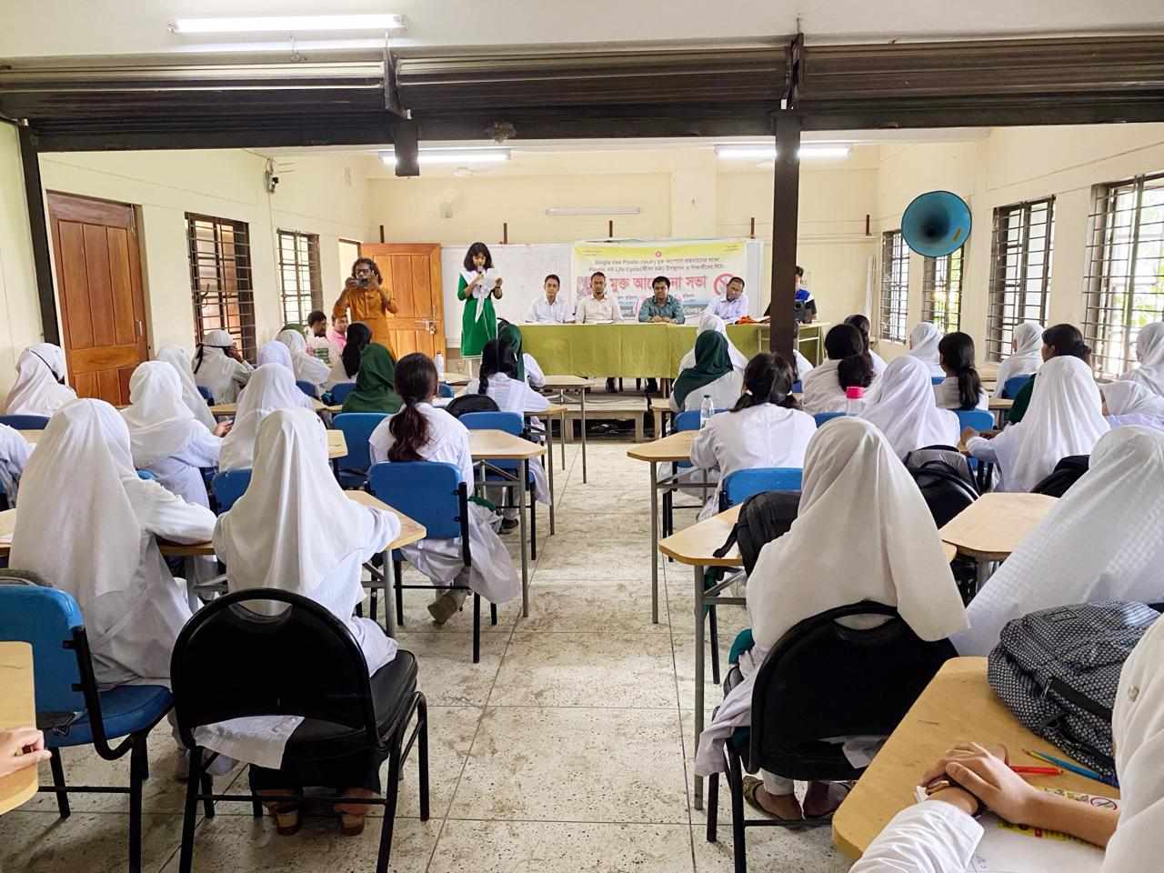 সভায় জেলা পরিবেশ অধিদপ্তরের সহকারী পরিচালক মোঃ রেজাউল করিম শুভেচ্ছা বক্তব্যে প্লাস্টিক এর লাইফ সাইকেল আলোচনা করেন এবং পরে উক্ত বিদ্যালয়ের শিক্ষার্থীদের নিয়ে "সিঙ্গেল ইউজ প্লাস্টিক" বন্ধে করণীয় শীর্ষক একটি মুক্ত আলোচনা সভা অনুষ্ঠিত হয়।