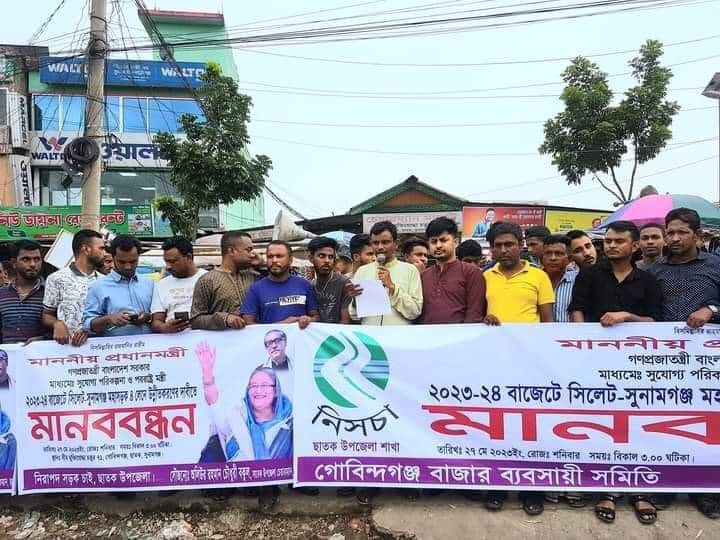 সিলেট-সুনামগঞ্জ আঞ্চলিক মহাসড়কটি ফোরলেনে উন্নতীকরণের দাবীতে মানববন্ধন অনুষ্ঠিত হয়েছে। ছাতক উপজেলা পরিষদের সাবেক চেয়ারম্যান অলিউর রহমান চৌধুরী বকুল এর সার্বিক সহযোগিতায় গোবিন্দগঞ্জ বাজার ব্যবসায়ী সমিতি ও নিরাপদ সড়ক চাই (নিসচা) ছাতক উপজেলা শাখার যৌথ উদ্যোগে শনিবার বিকেলে গোবিন্দগঞ্জ'স্থ "বীর মুক্তিযোদ্ধা চত্তর ৭১" মানববন্ধন কর্মসূচি অনুষ্ঠিত হয়।