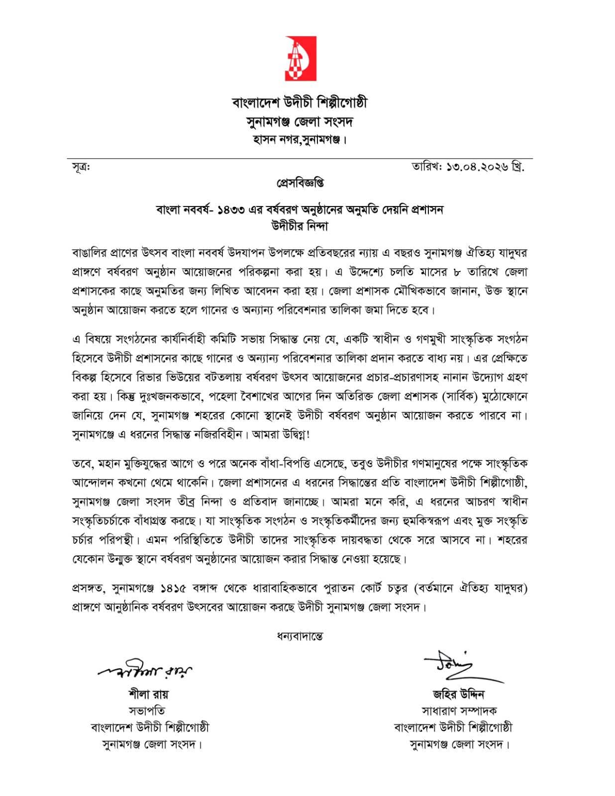 স্টাফ রিপোর্টার: সুনামগঞ্জে বাংলা নববর্ষ উদযাপন উপলক্ষে আয়োজিত বর্ষবরণ অনুষ্ঠানের অনুমতি দেয়নি প্রশাসন। এ ঘটনায় তীব্র প্রতিবাদ ও নিন্দা জানিয়েছে বাংলাদেশ উদীচী শিল্পীগোষ্ঠী, সুনামগঞ্জ জেলা শাখা।