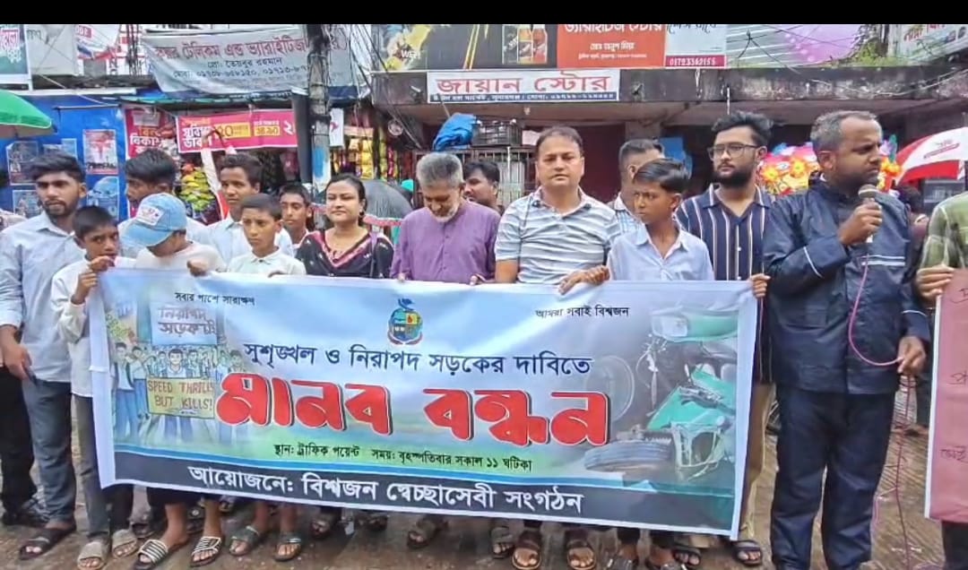 বৃহস্পতিবার সকাল সাড়ে ১১ টায় বিশ্বজন স্বেচ্ছাসেবী সংগঠনের উদ্যোগে স্থানীয় ট্রাফিক পয়েন্ট ঘন্টাব্যাপী মানববন্ধন অনুষ্ঠিত হয়।