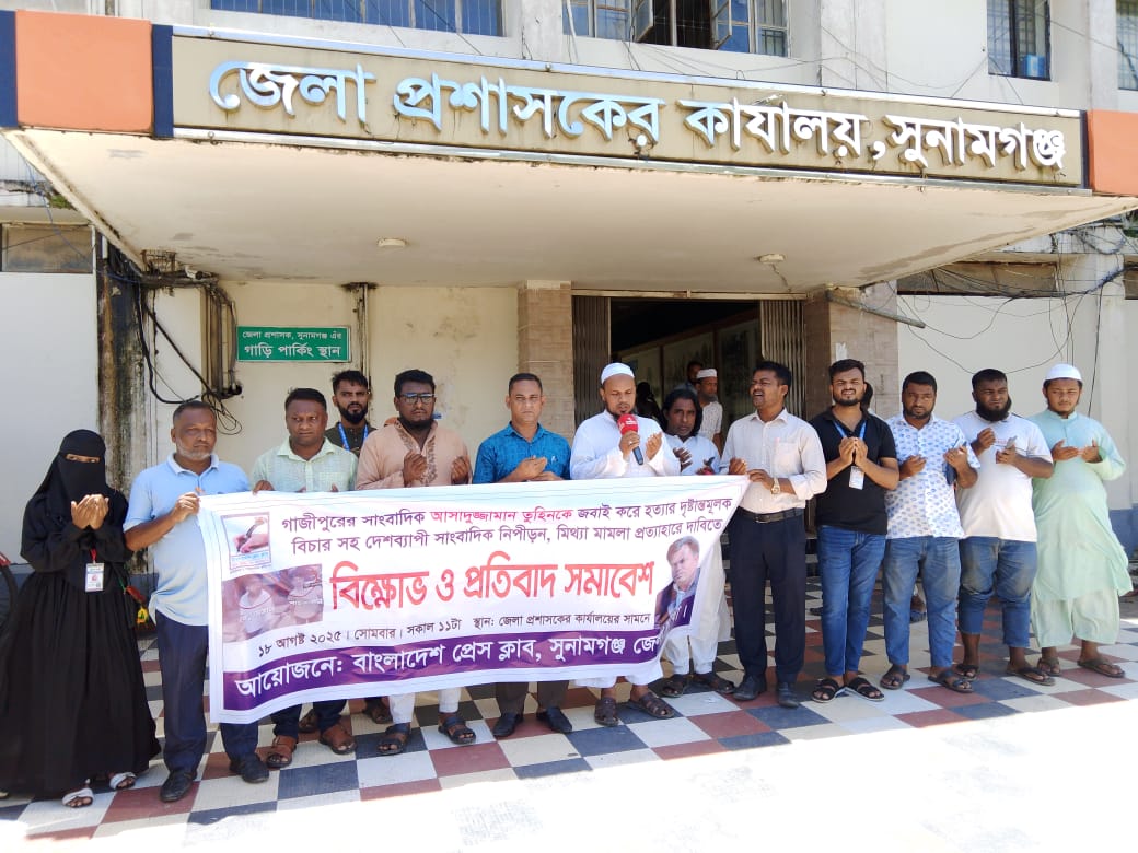 আয়োজক সংগঠনের জেলা কমিটির সভাপতি রাজধানী টিভি এবং দৈনিক বাংলাদেশ সমাচার পত্রিকার প্রতিনিধি এম আর সজীবের সভাপতিত্বে ও সাধারণ সম্পাদক এম তাজুল ইসলাম এর সঞ্চালনায় অনুষ্ঠিত মানববন্ধনে বক্তব্য রাখেন ইসলামী আন্দোলন বাংলাদেশ সুনামগঞ্জ জেলা শাখার সভাপতি মুফতি শহীদুল ইসলাম পলাশী, বাংলাদেশ জাতীয় সাংবাদিক সংস্থা সুনামগঞ্জ জেলা শাখার সভাপতি ও প্রেসক্লাবের সিনিয়র সহ-সভাপতি আল হেলাল,বাংলাদেশ জাতীয় সাংবাদিক সংস্থার সাধারণ সম্পাদক দৈনিক ইনকিলাব প্রতিনিধি মোঃ হাসান চৌধুরী, দৈনিক খবরপত্র প্রতিনিধি হোসাইন মাহমুদ শাহীন,দৈনিক জনতা প্রতিনিধি মোঃ আফতাব উদ্দিন,দৈনিক ঘোষণা পত্রিকার স্টাফ রিপোর্টার শফিকুল বারিসহ স্থানীয় বিভিন্ন সামাজিক,রাজনৈতিক,আইনজীবী, শিক্ষক, শ্রমিক সহ বিভিন্ন শ্রেনী পেশার প্রতিনিধিগন। বিক্ষোভ সমাবেশে বক্তারা বলেন ,সাংবাদিক আসাদুজ্জামান তুহিন এর হত্যাকারীদের দ্রুত বিচার নিশ্চিত করতে সরকারকেই এগিয়ে আসতে হবে। তার পরিবারকে আর্থিক ক্ষতিপূরণ দিয়ে সঠিকভাবে পূনর্বাসনের দাবী দেশের সকল সাংবাদিকদের প্রাণের দাবীতে পরিণত হয়েছে। বক্তারা জার্নালিষ্ট প্রটেকশন এ্যাক্ট প্রণয়নের মাধ্যমে দেশের সকল গণমাধ্যম কর্মীদের নিরাপত্তা নিশ্চিত করার দাবি জানান।