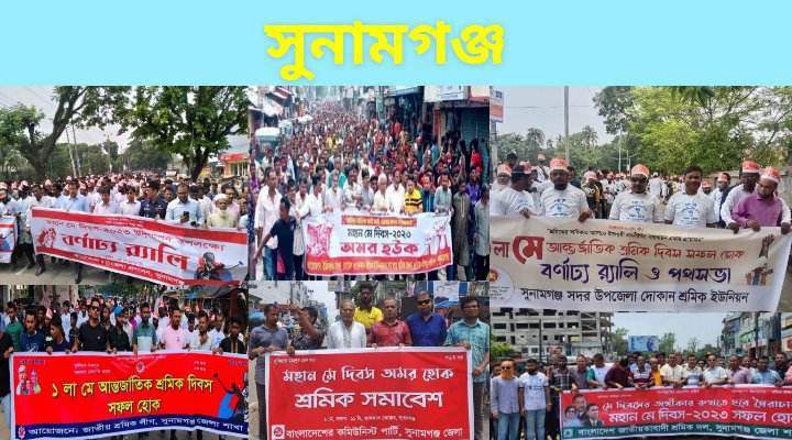 জাতীয় শ্রমিকলীগ সুনামগঞ্জ জেলা শাখার উদ্যোগে অনুষ্ঠিত কর্মসুচিতে জেলা সভাপতি সেলিম আহমদ,বাংলাদেশের কমিউনিস্ট পার্টি আয়োজিত সভায় জেলা সিপিবির সভাপতি প্রভাষক চিত্তরঞ্জন তালুকদার ও বাংলাদেশ ট্রেড ইউনিয়ন সংঘ আয়োজিত কর্মসুচিতে সাইফুল আলম ছদরুল নেতৃত্ব দেন।