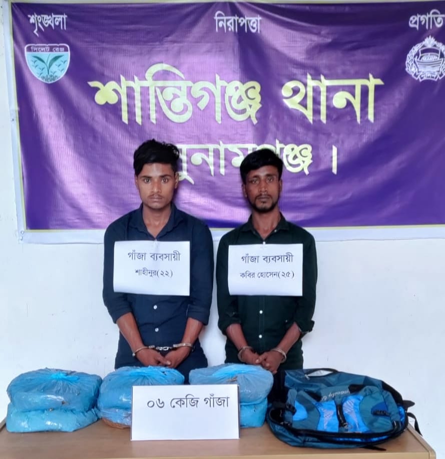 সুনামগঞ্জ জেলার শান্তিগঞ্জ থানা এলাকায় মাদক উদ্ধার ও বিশেষ অভিযান পরিচালনাকালে গোপন সংবাদের ভিত্তিতে অফিসার ইনচার্জের নির্দেশক্রমে এসআই মোহন রায় ও এএসআই দিবাস চন্দ্র দাস অদ্য ১৩-০৫-২০২৩ খ্রি. সকাল ০৮:৫৫ ঘটিকায় শান্তিগঞ্জ থানাধীন শান্তিগঞ্জ বাজারের জনৈক মোঃ জুনাহিদ আহমদের সবজির দোকানের সামনে সঙ্গীয় ফোর্সের সহায়তায় অভিযান পরিচালনা করে মাদক ব্যবসায়ী ১। শাহিনুর (২২), পিতা-মোঃ আনোয়ার হোসেন, গ্রাম-নয়াহালট, ২। কবির হোসেন (৩০), পিতা-মৃত তারা মিয়া, গ্রাম-কামলাবাজ, উভয় থানা-জামালগঞ্জ, জেলা-সুনামগঞ্জদ্বয়কে আটক করেন। আটককৃত আসামিদ্বয়ের নিকটে থাকা ১টি সাদা রংয়ের প্লাস্টিকের ব্যাগ এবং ১টি কাঁধে ঝুলানো স্কুল ব্যাগ তল্লাশি করে বিশেষভাবে রক্ষিত নীল রংয়ের পলিথিনে মোড়ানো মোট ০৬ (ছয়) কেজি মাদকদ্রব্য (গাঁজা) উদ্ধারপূর্বক সাক্ষীদের উপস্থিতিতে জব্দ তালিকামূলে জব্দ করা হয়। ধৃত আসামিদ্বয় পেশাদার মাদক ব্যবসায়ী। তারা পরস্পর যোগসাজসে দীর্ঘদিন যাবৎ জামালগঞ্জ, শান্তিগঞ্জসহ আশপাশের থানা এলাকায় মাদকদ্রব্য (গাঁজা) ক্রয়-বিক্রয় করে আসছিল। গ্রেফতারকৃত আসামিদ্বয় উদ্ধারকৃত গাঁজা বিক্রয়ের উদ্দেশ্যে শান্তিগঞ্জ বাজারে নিয়ে আসে বলে প্রাথমিক জিজ্ঞাসাবাদে জানা যায়। উক্ত বিষয় গ্রেফতারকৃত আসামিদ্বয়ের বিরুদ্ধে শান্তিগঞ্জ থানায় মাদকদ্রব্য নিয়ন্ত্রণ আইনে একটি নিয়মিত মামলা রুজু করা হয়েছে। আসামিদ্বয়কে যথাযথ পুলিশ স্কটের মাধ্যমে বিজ্ঞ আদালতে সোপর্দ করা হয়েছে।