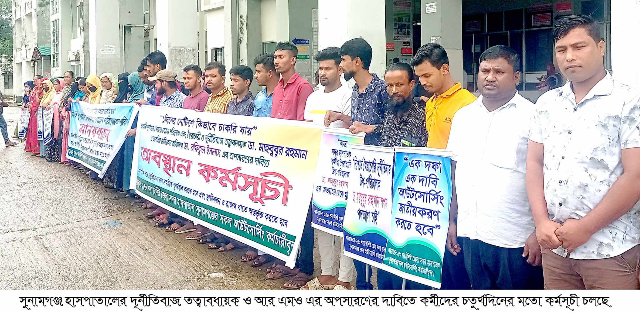 বৃহস্পতিবার সকাল ১০টা থেকে আউটসোর্সিংয়ের কর্মীরা হাসপাতালের সামনে জড়ো হয়ে তাদের অবস্থান কর্মসূচী ও মানববন্ধন করেছেন তারা।