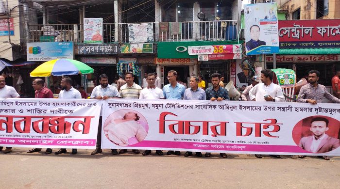 সুনামগঞ্জ প্রতিনিধিঃ অনিয়ম দুর্নীতির নিউজ প্রকাশের জেরে যুমনা টিভি সুনামগঞ্জ প্রতিনিধি আমিনুল ইসলামের উপর বর্বরোচিত পূর্বপরিকল্পিত সন্ত্রাসী হামলাকারীদের গ্রেফতার ও শাস্তির দাবিতে মানববন্ধন অনুষ্ঠিত হয়েছে৷ আজ শনিবার (৬ মে) দুপুরে