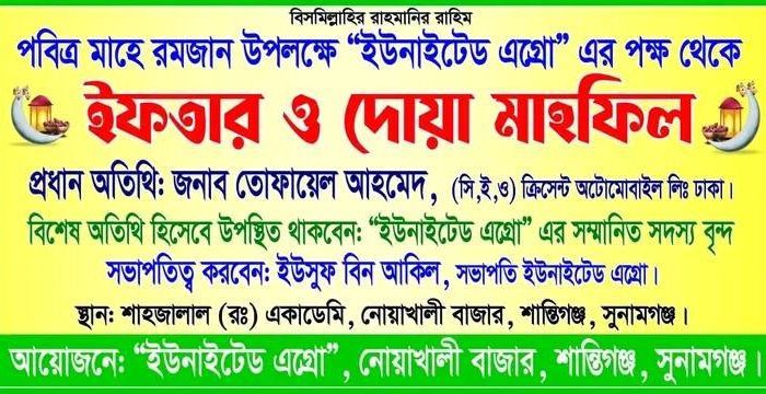 জাকির হোসাইন সুনামগঞ্জ প্রতিনিধি : অদ্য ২১/০৪/২০২৩ইং রোজ শুক্রবার সুনামগঞ্জ জেলার শান্তিগঞ্জ উপজেলার নোয়াখালী বাজারের শাহজালাল রঃ একাডেমিতে পবিত্র মাহে রমজান উপলক্ষে ইউনাইটেড এগ্রো এর পক্ষ থেকে ইফতার ও দোয়া
