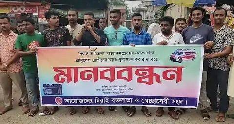 স্টাফ রিপোর্টার,মিতালী রানি দাস: উপজেলা স্বাস্থ্য কমপ্লেক্সে অব্যাবহৃত অ্যাম্বোলেন্স সচলের দাবিতে সুনামগঞ্জের দিরাইয়ে মানববন্ধন অনুষ্ঠিত হয়েছে। বৃহস্পতিবার বেলা ৫ ঘটিকায় পৌরসভার থানা পয়েন্টে দিরাই রক্তদাতা ও স্বেচ্ছাসেবী সংগঠনের আয়োজনে অনুষ্ঠিত
