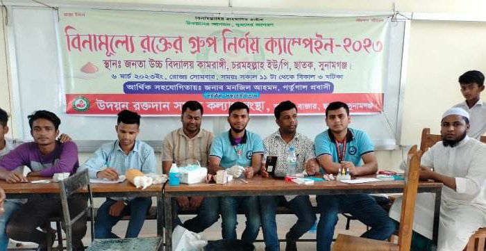 মোঃ তাজিদুল ইসলাম,স্টাফ রিপোর্টারঃ সুনামগঞ্জ ছাতকের জনতা উচ্চ বিদ্যালয় কামরাঙ্গী’তে উদয়ন রক্তদান সমাজ কল্যাণ সংস্থা কর্তৃক ফ্রি ব্লাড ক্যাম্পিং অনুষ্ঠিত হয়েছে। জনতা উচ্চ বিদ্যালয় কামরাঙ্গীর ২৫৬ জন শিক্ষার্থীদের কে