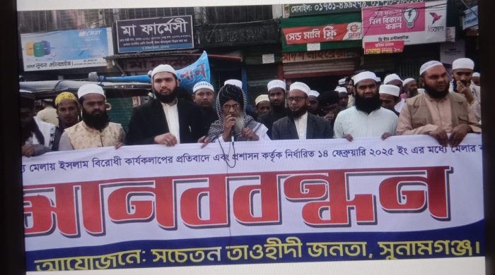 চলমান ডেক্স:সুনামগঞ্জে বাণিজ্য মেলায় ইসলামবিরোধী কার্যকলাপের প্রতিবাদে এবং প্রশাসন কর্তৃক নির্ধারিত সময়ের (১৪ ফেব্রুয়ারি) মধ্যে মেলার কার্যক্রম শেষ করার দাবিতে মানববন্ধন ও বিক্ষোভ হয়েছে। শুক্রবার (১৪ ফেব্রুয়ারি ) বাদ জুম্মা